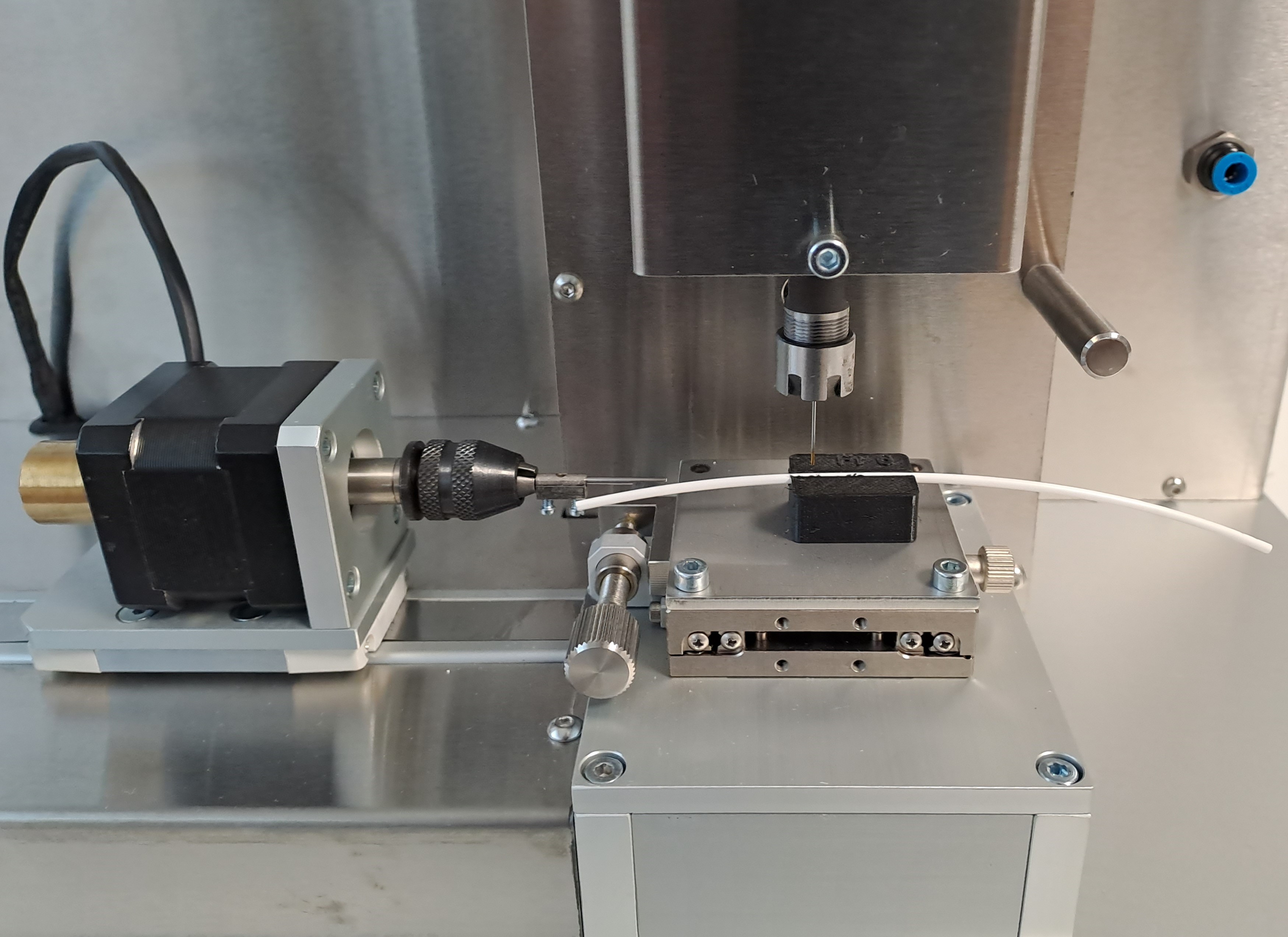 If required, the machine can also be used for manual drilling of e.g. pigtail catheters. Drill jigs is easily changed, to account for difference in CH size and tube shape.