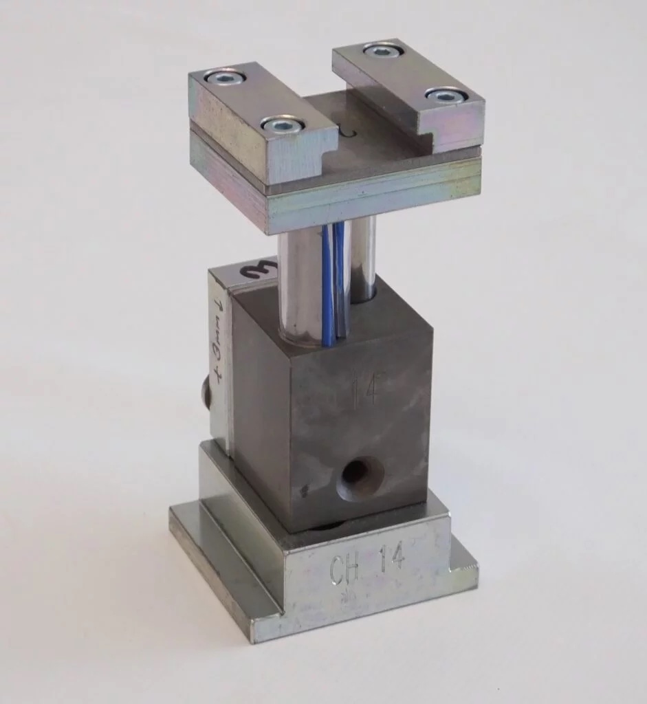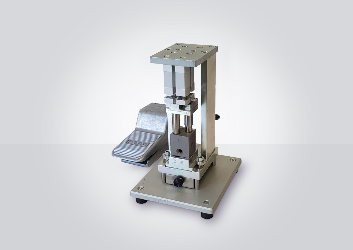 The PP 41-00 is pneumatically driven; an air cylinder activates the two punching needles. The air cylinder is controlled with a foot pedal. When the foot pedal is pressed, the air cylinder presses the needles down and pulls them back up when the pedal is released.